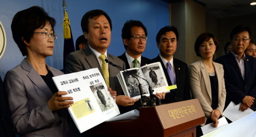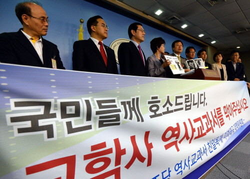 민주당 ‘역사교과서 친일독재 미화왜곡 대책위원회’는 12일 오전 서울 여의도 국회 정론관에서 기자회견을 열고 교학사 한국사 역사교과서 검정취소를 요구했다.