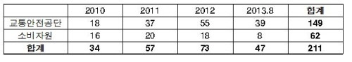 에어백 오작동 신고 건수는 최근 4년 간 2010년 34건, 2011년 57건, 2012년 73건, 2013년 8월까지 47건 등으로 급증하는 추세임에도 불구하고 제작결함신고센터 측 접수된 149건 이외에 소비자원에 접수된 신고 사례 82건에 대해서는 파악조차 하지 않았다.