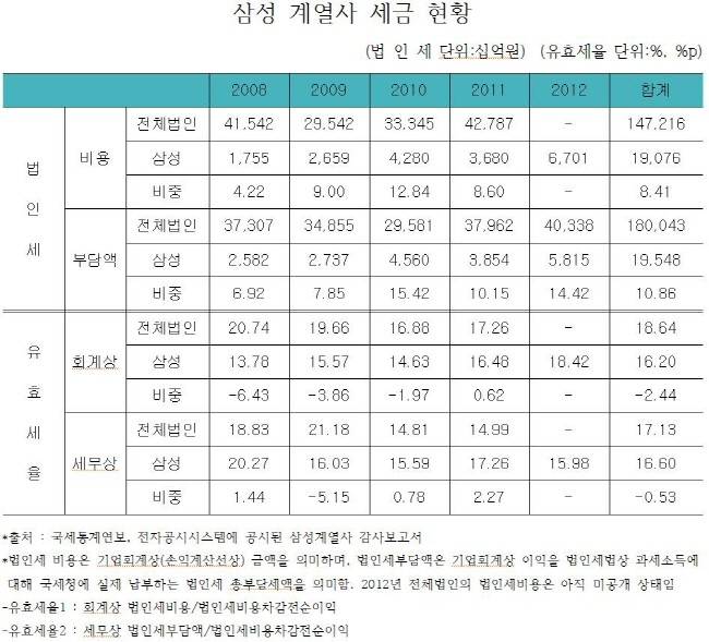 지난 5일 국회 기획재정위원회 소속 정의당 박원석 의원은 “2008년부터 2012년까지 기업 실적 현황을 분석해 본 결과 한국경제 전체 실적에서 삼성그룹의 비중이 점차 커지고 있지만 법인세 납부 비중은 크게 늘어나지 않고 있다”고 주장했다.
