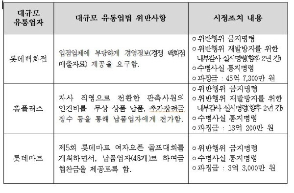 공정위 관계자는 “대규모 유통업자의 불공정거래행위를 지속적으로 감시할 것”이라면서 “대규모 유통업법 위반사례에 대한 엄중한 제재를 할 계획”이라고 말했다.