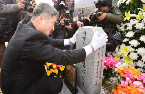 | ▲ 묘비를 어루만지는 서 하사의 아버지ⓒNewsis | ||