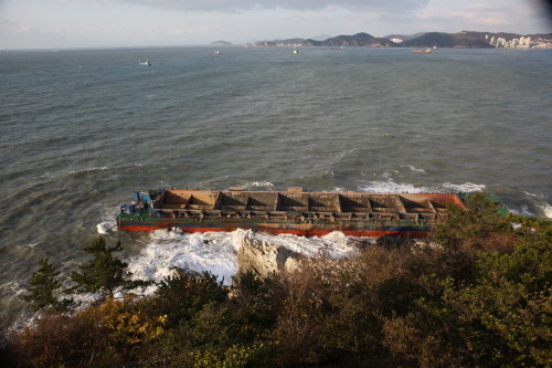 부산해양경찰(이하 해경)에 따르면 부산 영도구 태종대 해안가에서 25일 새벽 2시 30분쯤 기상악화로 인해 당시 바지선을 끌던 예인선의 예인줄이 끊어지면서 바지선은 연안에 좌초되고, 예인선은 태종대 연안에 좌초됐다.