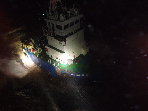 | ▲ 기상악화로 좌초된 예인선 <사진=부산해양경찰서 제공> | ||