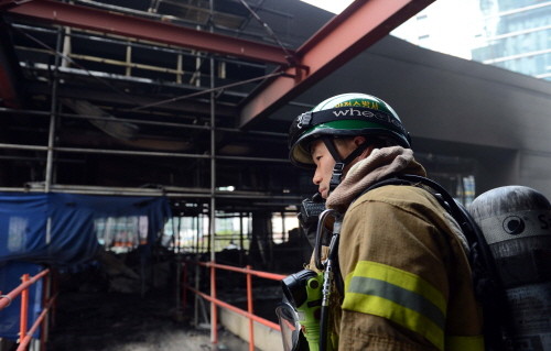 | ▲ 화재 진압 후 무전하는 소방관 | ||