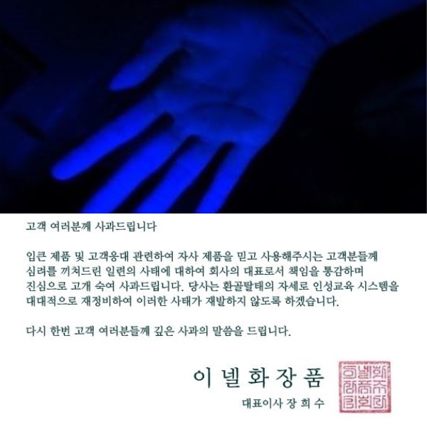| ▲ D커뮤니티 게시판에 올라 형광반응을 보인 입큰 비비크림을 바른 작성자의 손(사진 상단)과 사태가 커지자 이넬화작품 측이 보낸 사과문 일부<사진=온라인 커뮤니티/ 이넬화장품 캡쳐본> | ||