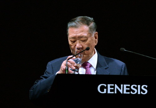 | ▲ 제네시스 신차발표회장에 나선 현대기아차 정몽구 회장.최근 대규모 소송에 보상금을 지급하는 등 곤욕을 치른 현대기아차는 미국시장에서 잇단 최악의 평가를 받으면서 그 위상이 추락하고 있다.©Newsis | ||