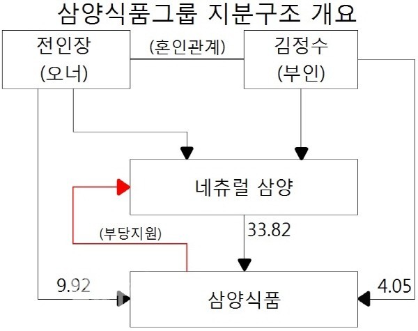 네츄럴삼양은 삼양라면에 들어가는 스프를 만들기 위해 설립한 위성기업으로 전 회장과 부인 김정수 씨가 지분의 63.2%를 가지고 있는 사실상 개인회사다. 나머지 지분조차도 26.9%는 계열사인 비글스, 9.90%는 자사주로 되어져 있어 단 한 주도 외부에 반출되지 않았다.