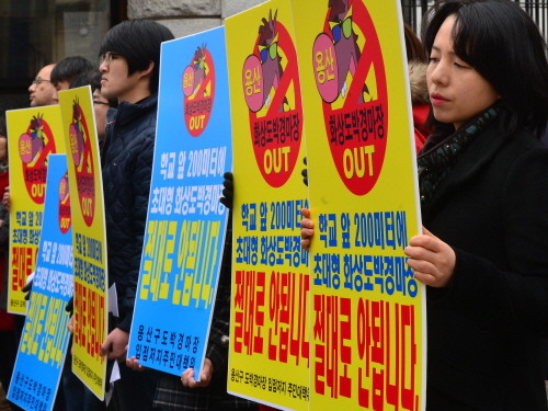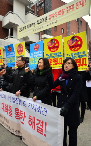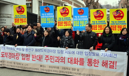 ‘용산구 화상경마도박장 입점 저지 주민대책위’의 주최로 서울 용산구 원효로 성심여자고등학교 앞에서 7일 오후 신임 마사회장 취임 및 용산구 화상도박경마장 입점 시도에 대한 입장발표 기자회견이 열렸다. 이날 참가자들은 화상도박경마장 입점을 극렬하게 반대했다.