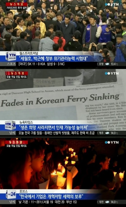월스트리트 “세월호 침몰 사고가 박근혜 정부의 위기관리 능력이 시험대 올랐다”며 “한국 정부의 안일한 대처에 대한 국민들의 분노가 인터넷을 통해 전해지고 있다”고 덧붙였다.