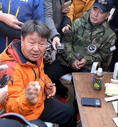 | ▲ 23일 전남 진도 팽목항에서 민간다이버 단체 관계자가 "실종자들을 구조하기 위한 여러가지 아이디어를 제안했지만 정부가 모두 묵살했다"며 취재진에게 불만을 전하고 있다. ⓒNewsis | ||