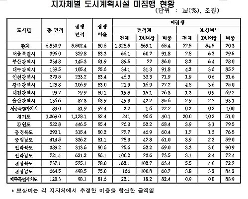 26일 국회 국토교통위원회 소속 전현희 더불어민주당 의원이 국토교통부에서 제출받은 지자체별 도시계획시설 미집행 현황에 따르면 재정 부족 등을 이유로 미집행된 도시계획시설 부지가 서울시 면적(605.2㎢)의 두 배가 넘는 1328.5㎢에 달하는 것으로 드러났다. 미집행 보상비는 77조5000억원으로 추정된다.