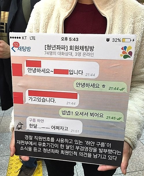 하지만 이날 오후 채팅방에 경찰이 들어와 있다는 제보를 받았다. 확인 결과 경찰로 추정되는 번호는 '경찰 정보관 전용 휴대전화 번호'로 드러났다고 청년좌파는 설명했다.