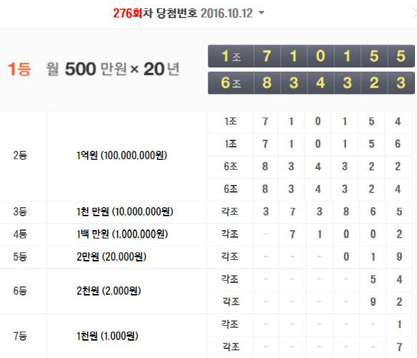 제276회차 연금복권 1등 당첨번호는 ▲1조 710155 ▲6조 834323 번호이다. 1등 당첨금에게는 매달 500만원씩 20년간 연금 형식으로 지급된다. 실수령액은 세금 22%를 떼면 390만원 정도 된다.
