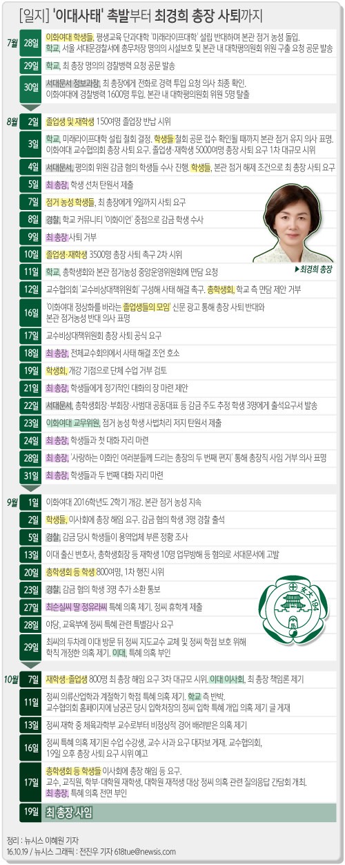[일요주간=노현주 기자] 이화여대 최경희 총장은 지난 19일 중도 사퇴했다. 1889년 문을 연 이화여대 130년 역사상 처음 있는 일이다. 이에 따라 최 전 총장 사퇴 후에도 '최순실 딸 특혜 의혹'에 대한 진실 규명 움직임이 지속될지 여부에 관심이 모인다.