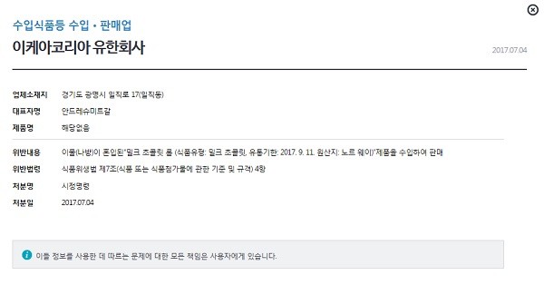 10일 식품의약품안전처가 운영하는 식품안전나라(www.foodsafetykorea.go.kr)에 따르면 이케아코리아는 지난 4일 식약처로부터 식약처 행정조치 중 하나인 시정명령 처분을 받았다. 이케아가 식품에 들어가서는 안되는 이물질(나방)이 혼입된 노르웨이산 '밀크 초콜릿롤' 제품을 수입·판매했기 때문이다.