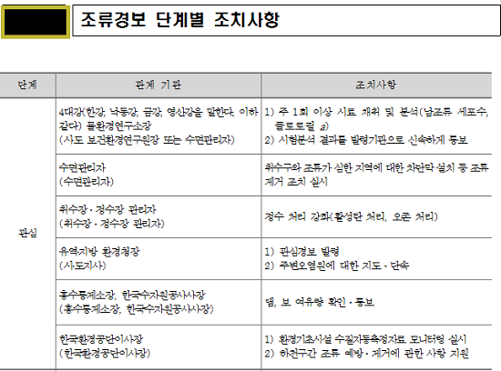 조류경보 '관심' 단계는 남조류 세포 수가 2주 연속 1천cells/㎖ 이상일 때 발령된다. 이번에 조류경보가 발령된 판문 정수장은 유해 남조류 세포 수는 지난 17일 1천836cells/㎖에서 지난 24일 6천222cells/㎖로 3배 가까이 급증했다.