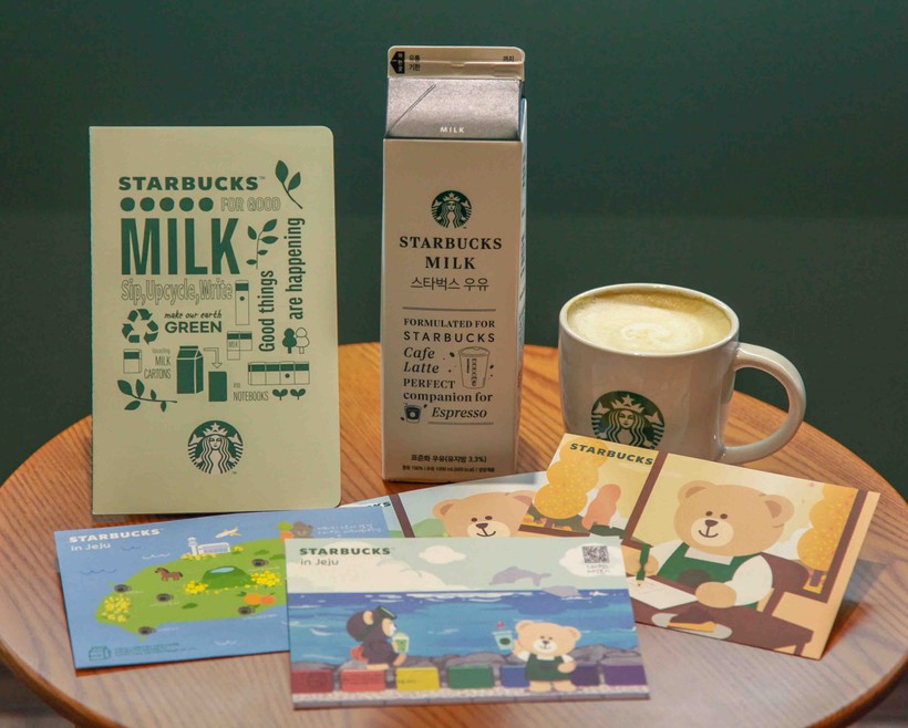 패밀리 프렌들리 콘셉트 매장인 세종예술의전당점에서는 어린이 동반 고객이 직접 텀블러를 꾸밀 수 있도록 제공되는 드로잉 속지를 우유팩 재생 소재로 제작해 자원 순환의 의미를 더했다. 이와 함께 국립박물관문화재단과 협업해 선보인 굿즈 소개 리플렛 노트 표지, 세계 환경의 달을 맞아 증정한 업사이클링 노트 등 다양한 친환경 제품도 선보였다.