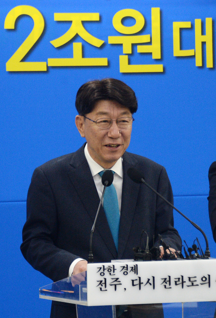 | ▲ 우범기 전주시장이 4일 전북 전주시 전주시청 회의실에서 '전주시, 3년 연속 2조원대 국비 확보' 기자회견을 열고 회견문을 낭독하고 있다. (사진=newsis) |