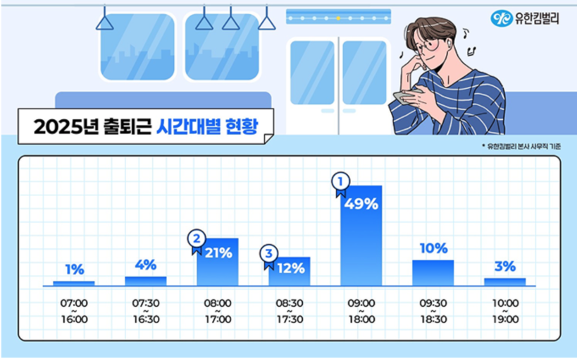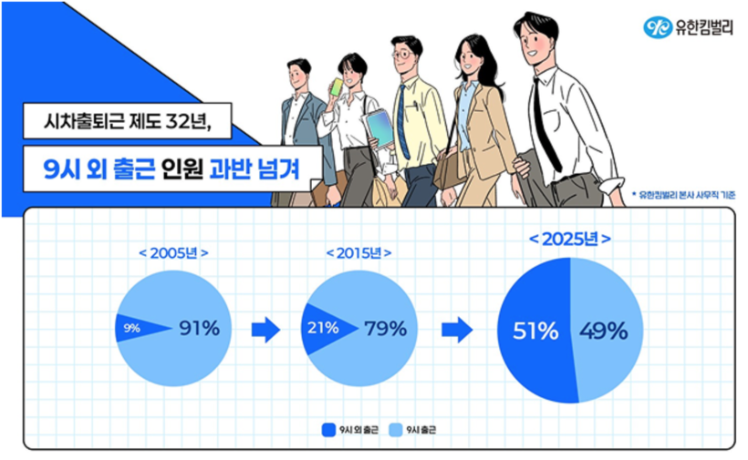 [일요주간 = 엄지영 기자] 유한킴벌리가 1994년 도입한 시차출퇴근제가 정착해 2025년 본사 관리직의 9시 외 출근 비율이 처음으로 51%를 기록하며 ‘나인투식스’를 넘어서는 등, 유연근무제가 기업 문화이자 경쟁력으로 자리잡았다.