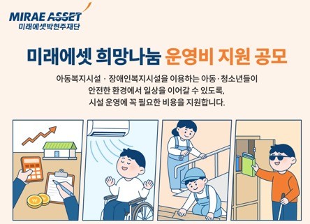 [일요주간=김성환 기자] 미래에셋박현주재단이 아동복지시설을 대상으로 운영비를 지원하는 ‘미래에셋 희망나눔’ 공모사업을 진행한다.