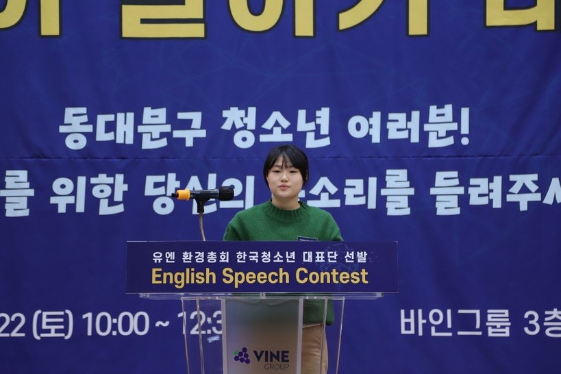 | ▲ 22일 서울 동대문구 바인그룹에서 열린 ‘유엔 환경총회 한국 청소년대표단 선발 영어말하기 대회’에서 첫 번째 경연자로 나선 채희연 학생이 발표를 하고 있다.(사진=(사) 에스디지유스) |
