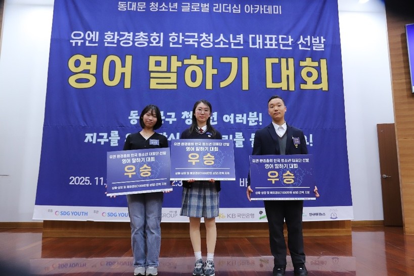 [일요주간=김성환 기자] 한국 청소년대표단 3명이 내달 케냐 나이로비에서 열리는 제7차 유엔 환경총회(UNEA-7)에 참가한다. 사단법인 에스디지유스(SDG Youth)는 지난 22일 서울 동대문구 바인그룹에서 ‘유엔 환경총회 한국 청소년대표단 선발 영어말하기 대회’를 개최하고, 한별(휘경여자중 2학년), 권나현(전동중 2학년), 이도열(경희중 1학년) 등 3명을 최종 선발했다고 28일 밝혔다.