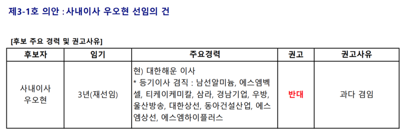 연구소는 우선 제3-1호 의안인 우오현 사내이사 후보의 재선임 건에 대해 ‘반대’를 권고했다. 공정거래법상 기업집단 SM의 동일인인 우 후보가 현재 대한해운 외에도 남선알미늄, 에스엠벡셀, 티케이케미칼 등 3개 상장계열사와 삼라, 에스엠상선 등 8개 비상장계열사에서 이사직을 겸임하고 있다는 점을 문제 삼았다.