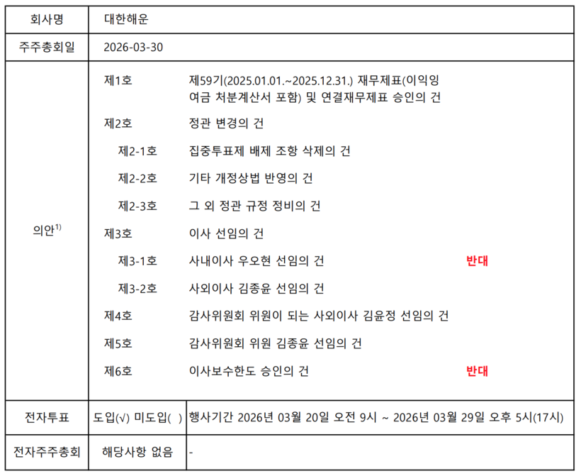 한편 이번 대한해운 주주총회에서는 재무제표 승인과 더불어 집중투표제 배제 조항 삭제를 골자로 하는 정관변경, 사외이사 및 감사위원 선임 등 총 6개 의안이 다뤄질 예정이다. 전자투표는 3월 20일부터 29일까지 진행된다.