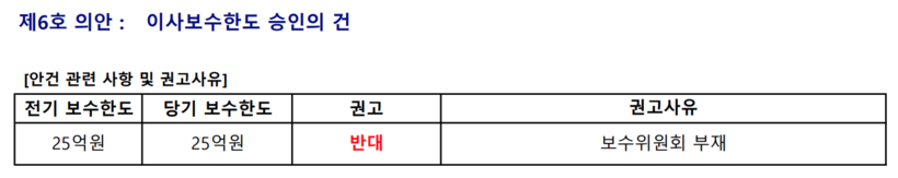 또한 제6호 의안인 이사 보수한도 승인의 건에 대해서도 반대 권고를 내렸다. 대한해운은 올해 이사 보수한도를 전기와 동일한 25억 원으로 상정했으나 연구소는 보수 산정의 절차적 정당성이 부족하다고 분석했다.