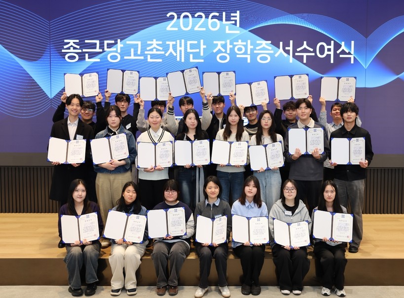 종근당고촌재단은 최근 서울 충정로 종근당 본사에서 ‘2026년도 장학증서 수여식’을 개최하고 올해 신규 선발된 110명을 포함해 총 403명의 국내외 장학생을 지원한다고 밝혔다. 재단은 졸업 때까지 장학금과 무상기숙사를 제공하고 학술사업 등 다양한 공익활동을 포함해 연간 약 30억원 규모의 장학사업을 운영한다.