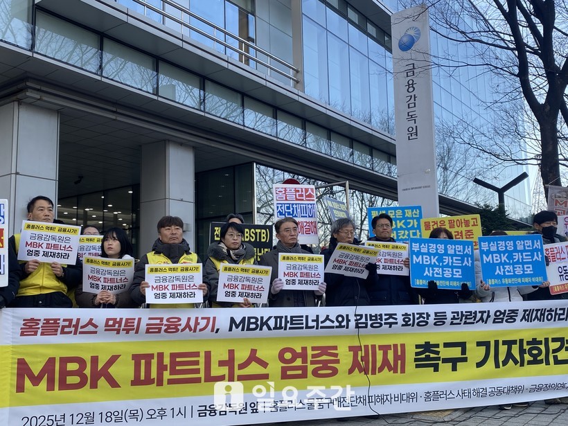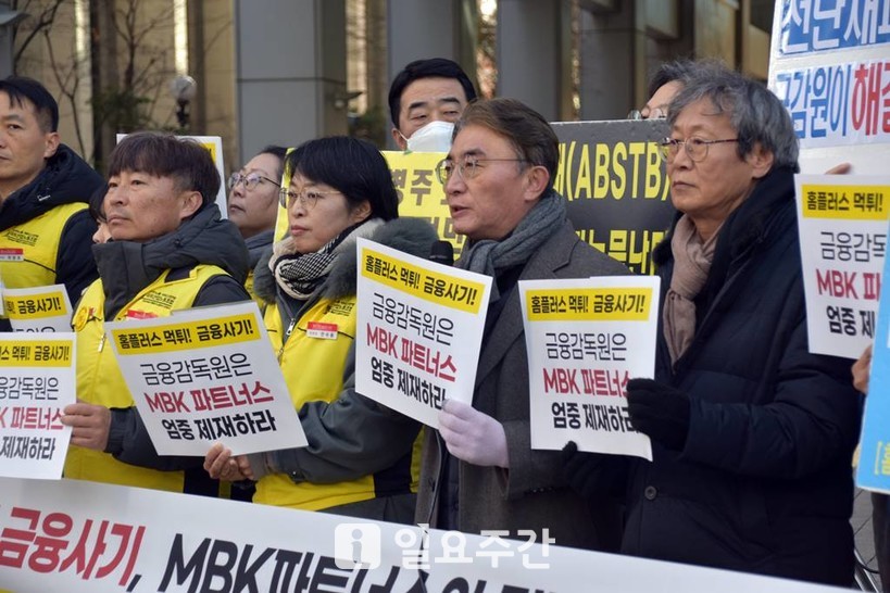 이날 기자회견은 금융감독원 제재심의위원회가 MBK파트너스의 홈플러스 관련 운용·지배구조와 유동화전단채(ABSTB) 발행·판매 과정에 대한 제재안을 심의하는 날에 맞춰 진행됐다.