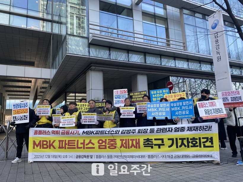 [일요주간=임태경 기자] 홈플러스 사태를 둘러싼 분노가 금융당국을 향했다. 홈플러스 사태 해결 공동대책위원회와 물품구매전단채 피해자 비상대책위원회, 금융정의연대는 지난 18일 서울 여의도 금융감독원 앞에서 기자회견을 열고 사모펀드 MBK파트너스와 김병주 회장 등 관련자들에 대해 최고 수위의 엄중한 제재를 요구했다.