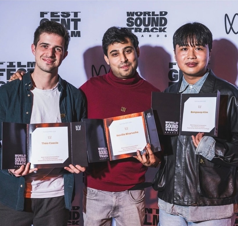 | ▲ 2025 WSA 영화 음악 작곡 결선자들 왼쪽부터 Theo Cascio, Neville bharucha, 김봉섭 |