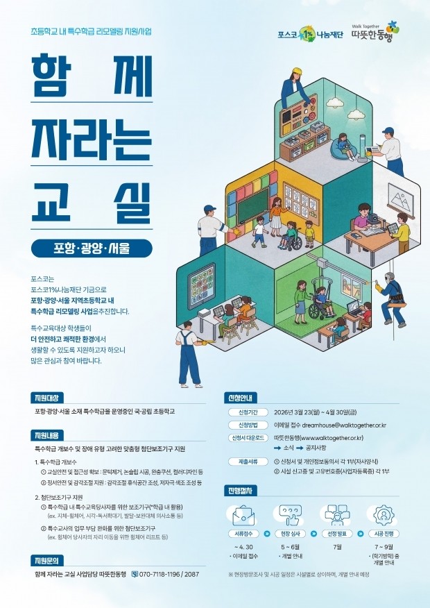 포스코1%나눔재단은 초등학교 특수학급을 대상으로 한 리모델링 지원사업 ‘함께 자라는 교실’을 추진한다고 밝혔다. 해당 재단은 임직원 기부와 기업 매칭그랜트로 운영되는 공익법인으로, 누적 기부금 1,000억원 이상을 바탕으로 다양한 사회공헌 활동을 이어오고 있다.