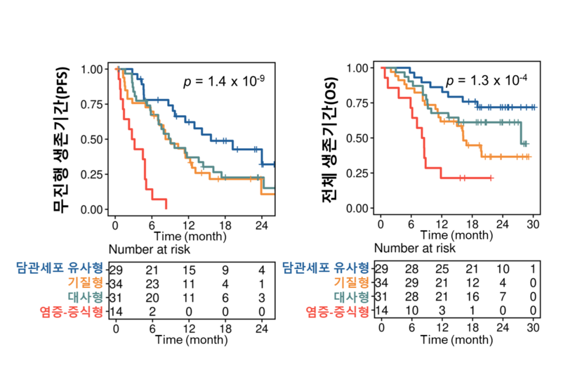 또 108명의 환자를 선별해 치료 전 종양 조직을 확보해 표적 유전체 분석과 RNA 시퀀싱 분석을 동시에 시행해 어떤 환자군이 젬시아 치료에 더 효과적인 지도 분석했다. 연구팀은 우선 담도암을 ▲담관세포 유사형(cholangiocyte-like), ▲기질형(stromal), ▲대사형(metabolic), ▲염증-증식형(inflammatory-proliferative)의 네 가지 분자 아형으로 분류했다.