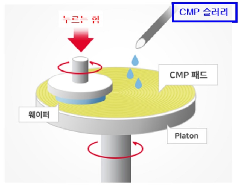 반도체 소자는 다수의 얇은 막이 적층돼 있어 정밀도를 높이기 위해서는 막이 형성될 때마다 연마제와 패드를 이용, 거친 면을 평탄화하는 공정이 필요하다. 이를 CMP 공정이라고 한다. 이 때 사용되는 연마제가 CMP 슬러리다.