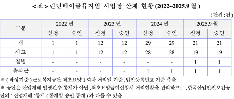 더불어민주당 이학영 의원은 근로복지공단으로부터 제출받은 ‘런던베이글뮤지엄 사업장 산재 현황’ 자료에 따르면 런던베이글뮤지엄은 2022년 1건, 2023년 12건, 2024년 29건, 2025년 9월 기준 21건의 산재가 신청됐고 전체건이 100% 승인된 것으로 확인됐다. 이 같은 산재 승인건수는 국내 굴지의 제빵 전문기업 보다도 많았다는 게 이 의원실의 설명이다.