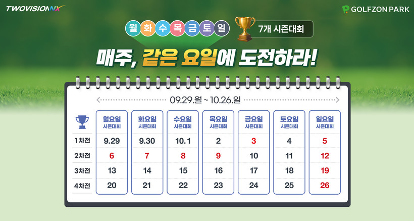 - 매주 같은 요일에 도전하는 새로운 방식의 시즌대회로 스크린골프 라운드 즐거움 배가