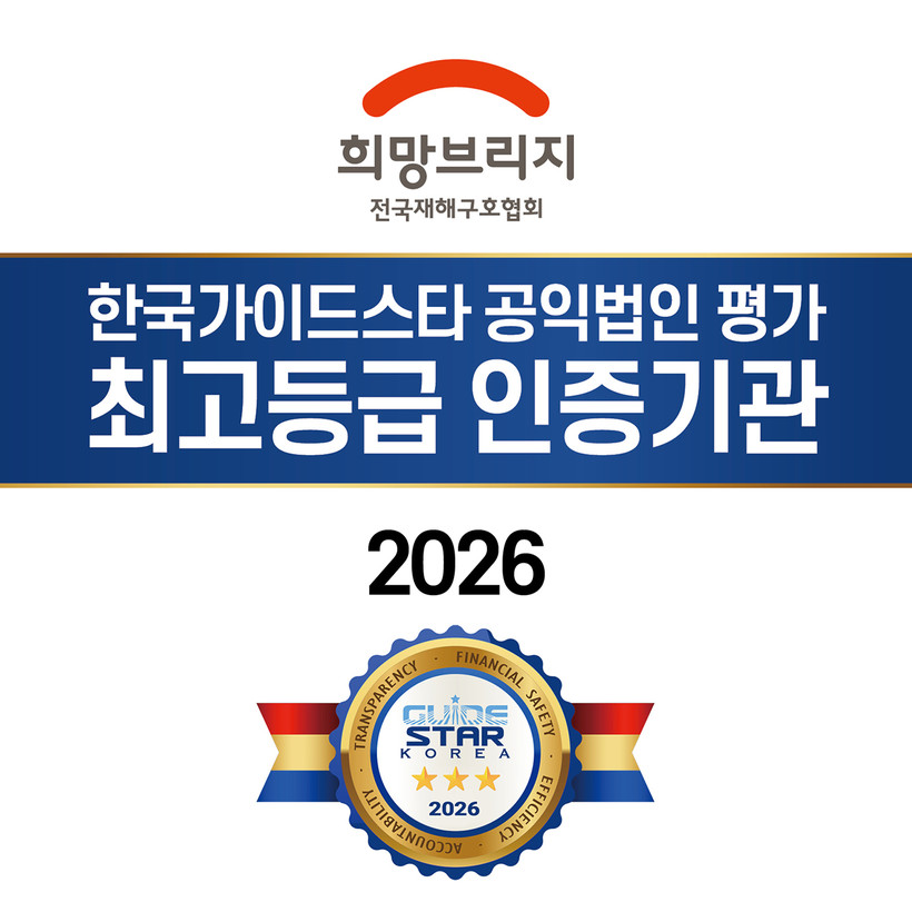 [일요주간 = 김성환 기자] 희망브리지 전국재해구호협회(회장 임채청)가 한국가이드스타(이사장 최중경)의 ‘2026년 공익법인 평가’에서 투명성과 재무 효율성 등 전 부문 만점을 기록하며 최고 등급인 ‘별 3개’를 획득했다. 창립 65주년을 맞이한 희망브리지는 이번 평가를 통해 국민의 성금을 정직하게 집행하는 재난 구호 전문기관으로서의 독보적인 신뢰와 전문성을 다시 한번 입증했다.