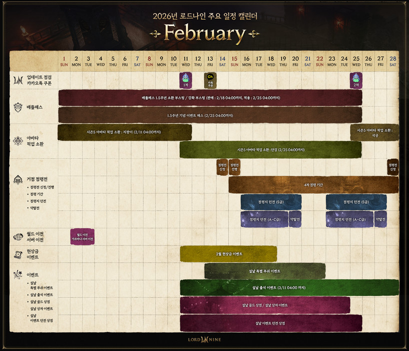 이번에 공개된 로드나인의 2월 캘린더에는 1.5주년 기념 배틀패스 2종과 지팡이, 단검 등의 아바타 픽업 기간, 4차 거점 점령전 등의 중요 이벤트와 콘텐츠 일정이 담겨 있다. 또한 월드 서버 이전, 설날을 기념한 각종 이벤트 계획도 공개됐다. 이에 따르면 설날 이벤트는 오는 11일부터 총 4종이 진행될 예정이다.