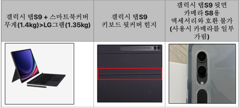 또 갤럭시 탭 울트라(732g)와 탭+키보드 장착시 무게는 1.4kg로 이는 LG그램(17인치) 1.35kg 보다 무겁다. 키보드까지 같이 쓰기에는 너무 무겁고 무릎에 얹어놓고 쓰기에도 힘들다는 불만이 나오고 있다.