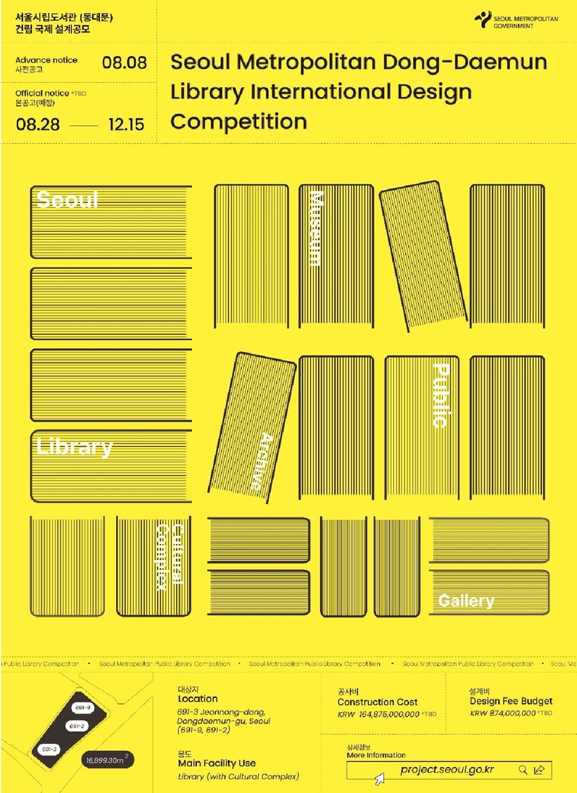 서울시립도서관(동대문) 국제설계 공모 정보는 8.8.(화)부터 '서울시 설계공모 누리집(project.seoul.go.kr)'을 통해 공개하고, 8월 말 본 공고를 통해 세부 공모지침과 일정 등을 추가로 안내할 예정이다.