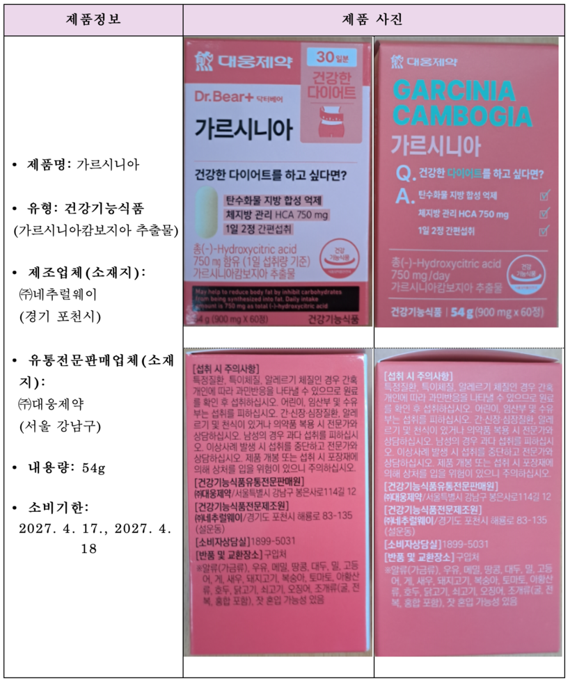 [일요주간 = 하수은 기자] 1만 원도 안 되는 가격으로 유통된 저가 건강기능식품이 결국 소비자 건강에 ‘직격탄’을 날렸다. 대웅제약이 유통하고 다이소 매장에서 판매된 체지방 감소 보조제 ‘가르시니아캄보지아 추출물’ 제품이 이상사례 발생으로 전량 회수 조치됐다. 해당 제품을 섭취한 소비자 2명이 급성 간염 증상을 호소했고, 식품의약품안전처(이하 식약처)는 이 제품과 이상사례 간 인과관계가 ‘매우 높다’는 최종 평가를 내렸다.