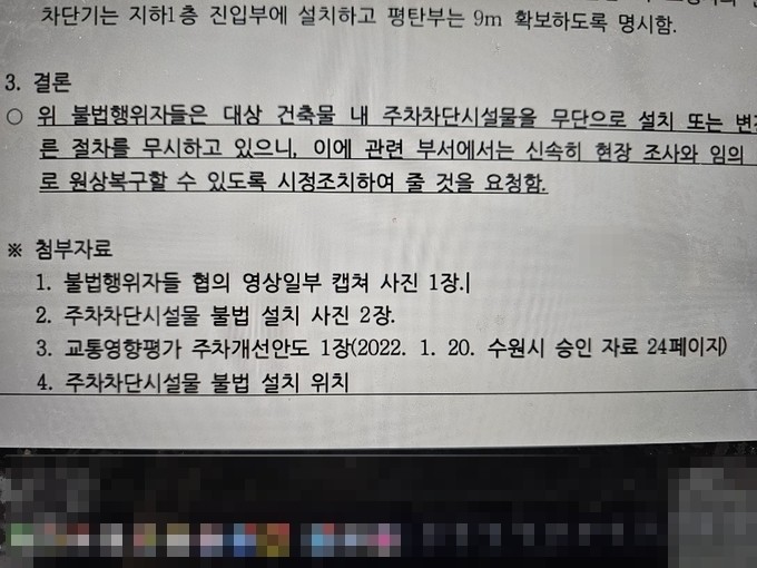 민원 신청서에 따르면 병원 측은 지난 1월 26일 집합건물법상 구분소유자 3분의 2 이상의 결의 없이 지하 1층 진입로에 주차차단기를 불법 설치했다. 이는 수원시청으로부터 승인받은 교통영향평가(2022년 1월) 결과와도 배치된다. 평가서에는 보행자 안전을 위해 평탄부 9m를 확보해야 한다고 명시되어 있으나 이를 무시하고 가파른 경사면에 시설을 설치해 안전사고 위험까지 초래하고 있다. 아진 측은 관리소장 J 씨를 영업방해 및 배임 혐의로 고소한 상태다.