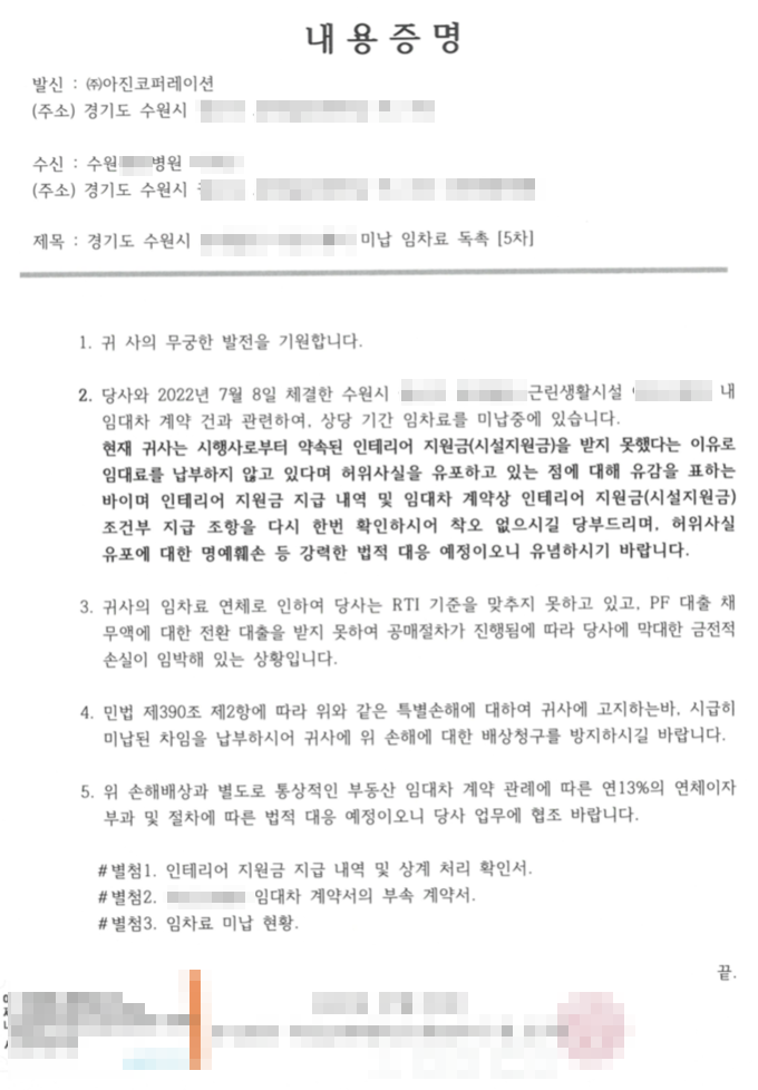 | ▲ ㈜아진코퍼레이션이 임대료 63억여 원을 미납 중인 수원 OO병원에 보낸 미납 임차료 독촉 내용증명. (이미지=㈜아진코퍼레이션 제공) |