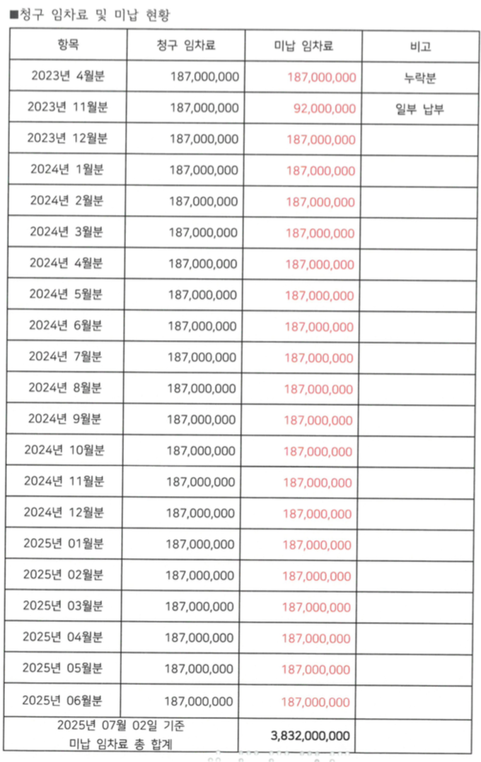 하지만 OO병원의 미납 행태는 렌트프리 기간이 종료된 2023년 4월부터 시작됐다. 병원 측은 현재(2026년 1월 31일 기준)까지 약 63억여 원(연체이자 포함)에 달하는 임대료를 지급하지 않고 있다. 계약서 제4조에 명시된 ‘6회 이상 연체 시 즉시 해지’ 조항에 따라 아진 측이 수차례 계약 해지 및 건물 명도를 요구했으나 병원 측은 이에 불응한 채 불법 점유 영업을 이어가고 있다.