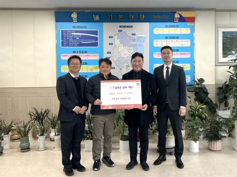 | ▲ 골프존문화재단이 13일 감포읍 행정복지센터에서 '2026 골프존 이웃사랑 행복나눔' 후원식을 개최했다 (왼쪽부터) 신순용 골프존카운티 감포 지배인, 오민규 감포읍장, 이승준 골프존카운티 사업부장, 박영준 골프존문화재단 팀장이 기념 촬영을 하고 있다. (사진=골프존 제공) |