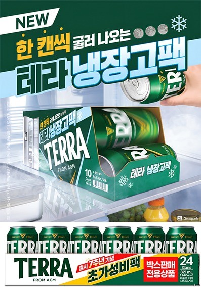 가족 모임이 잦은 명절 특성을 고려한 새로운 패키지도 출시된다. ‘테라 냉장고 팩’은 냉장고에 박스째 보관한 뒤 한 캔씩 꺼내 마실 수 있도록 디스펜서 형태로 디자인한 아이디어 상품이다. 350ml 캔 24개로 구성되며, 2월 셋째 주부터 전국 대형마트를 통해 만나볼 수 있다.