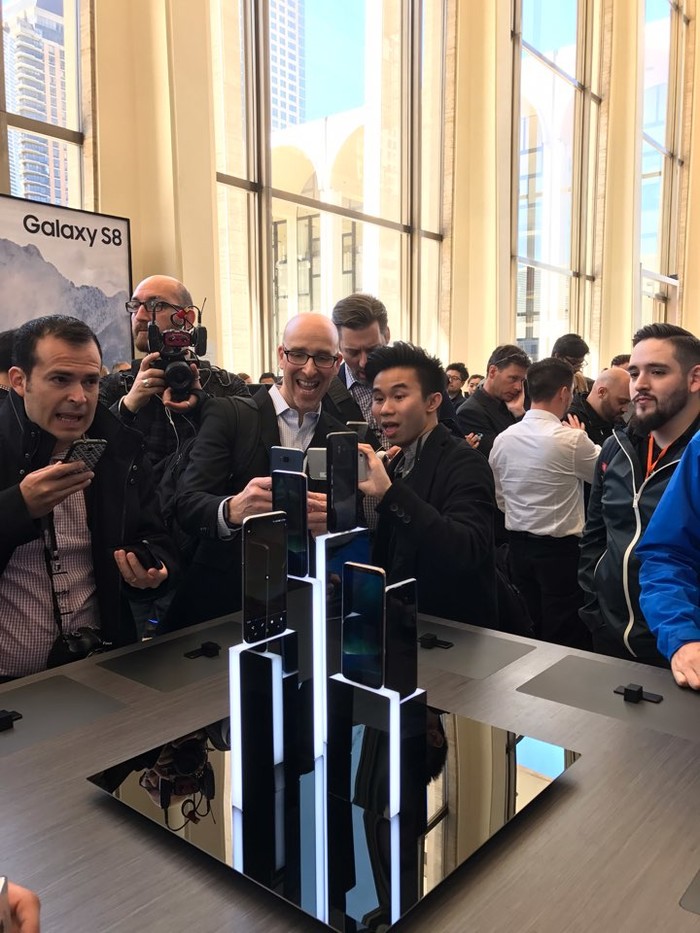 | ▲ 삼성전자는 지난달 29일 오전 미국 뉴욕 링컨센터에서 '언팩 2017' 행사를 열고 갤럭시S8 시리즈를 공개했다. 사진은 전 세계 취재진이 뒤섞여 갤S8 시리즈를 체험하고 있는 모습. | ||